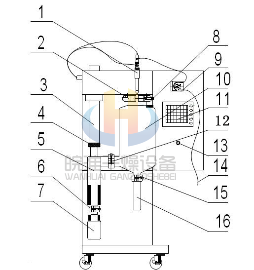 7、收集瓶;8、大卡箍; 9、蠕動泵; 10、干燥室; 11、觸摸屏;12、2 號卡箍; 13、電源開關;